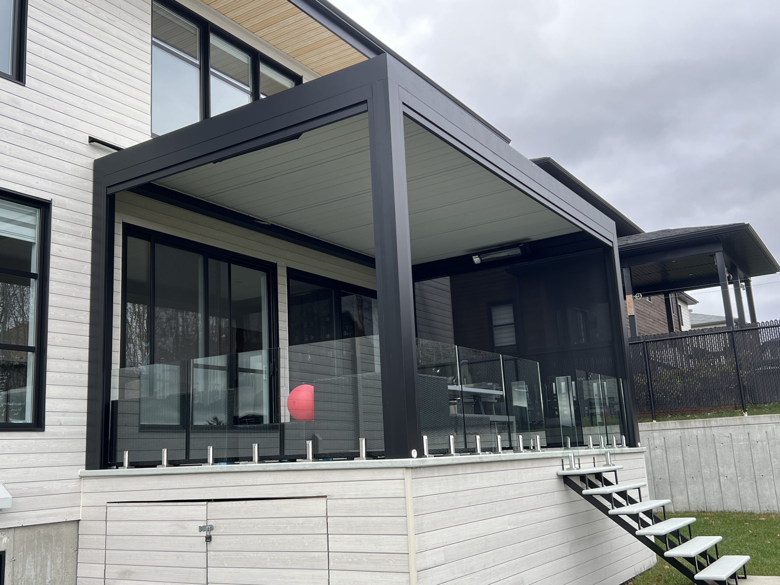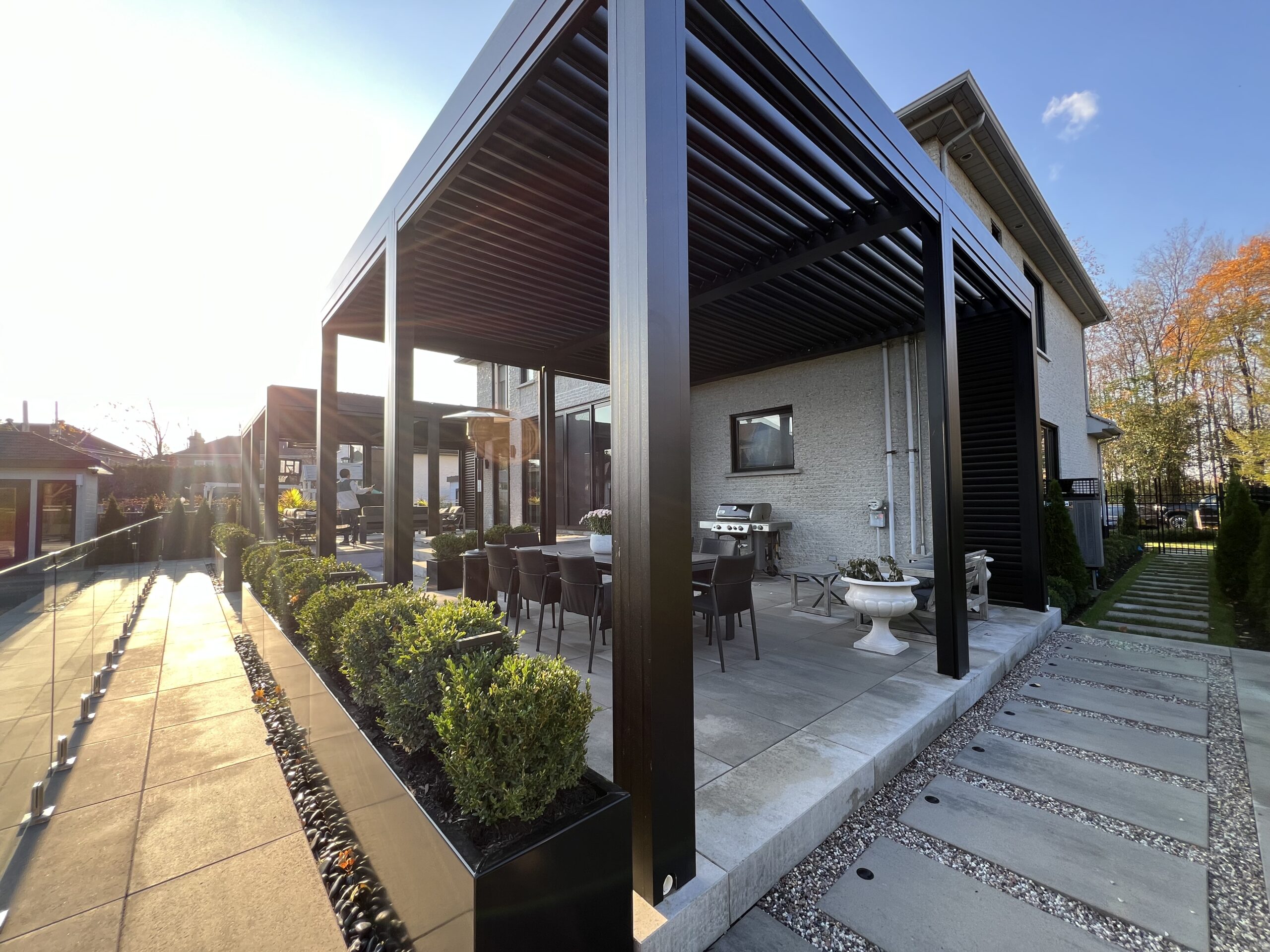この頑丈なルーバー屋根システムは、商業施設や、全天候型の豪華な屋外リビングエリアを作るのに最適です。